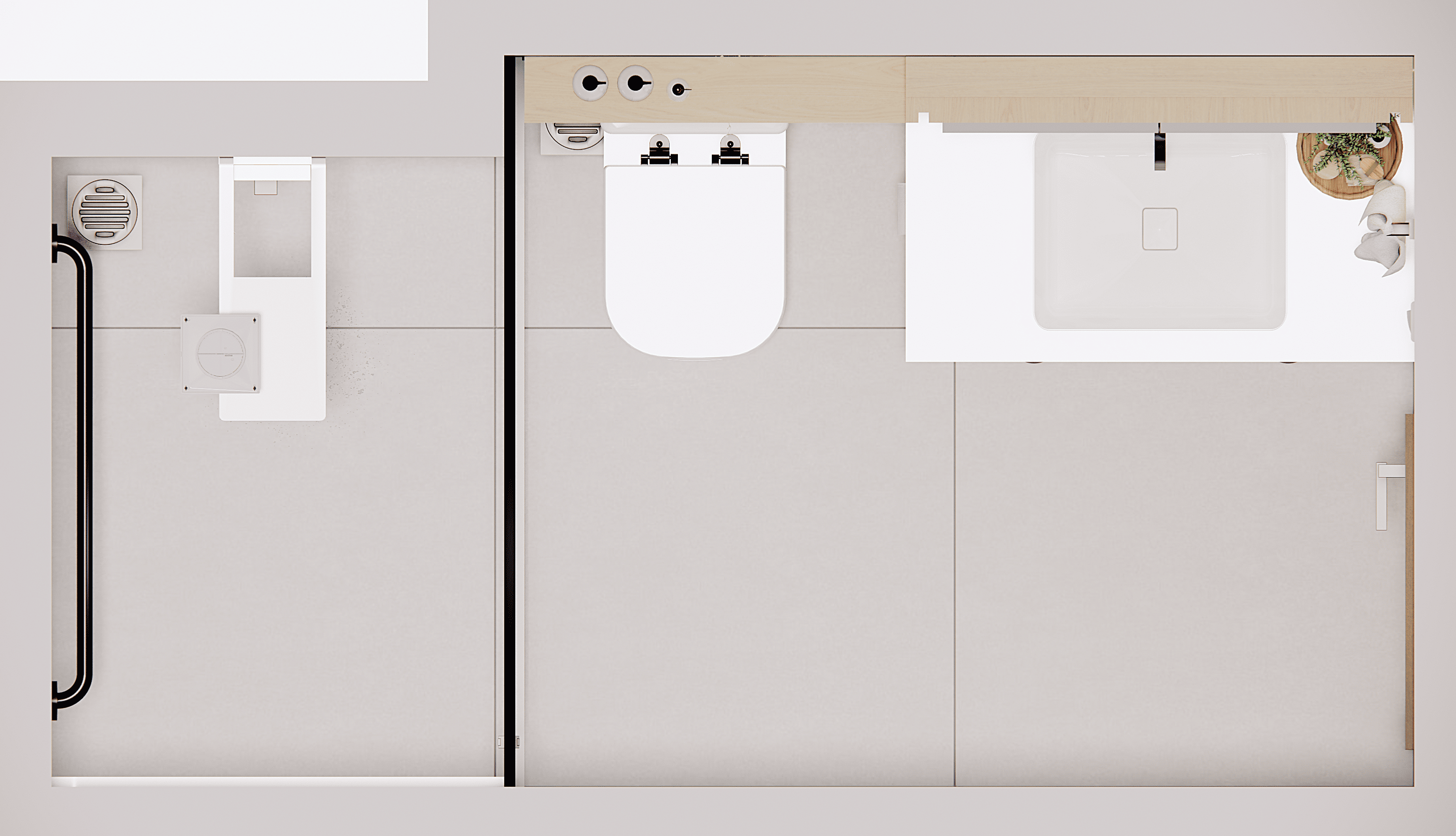 Para isso, o box foi ampliado, facilitando o acesso e tornando o uso mais confortável no dia a dia. Dentro dele, foi instalada uma barra de apoio, e o revestimento escolhido, com acabamento antiderrapante, foi aplicado tanto no piso quanto nas paredes, reforçando a segurança sem comprometer a estética.