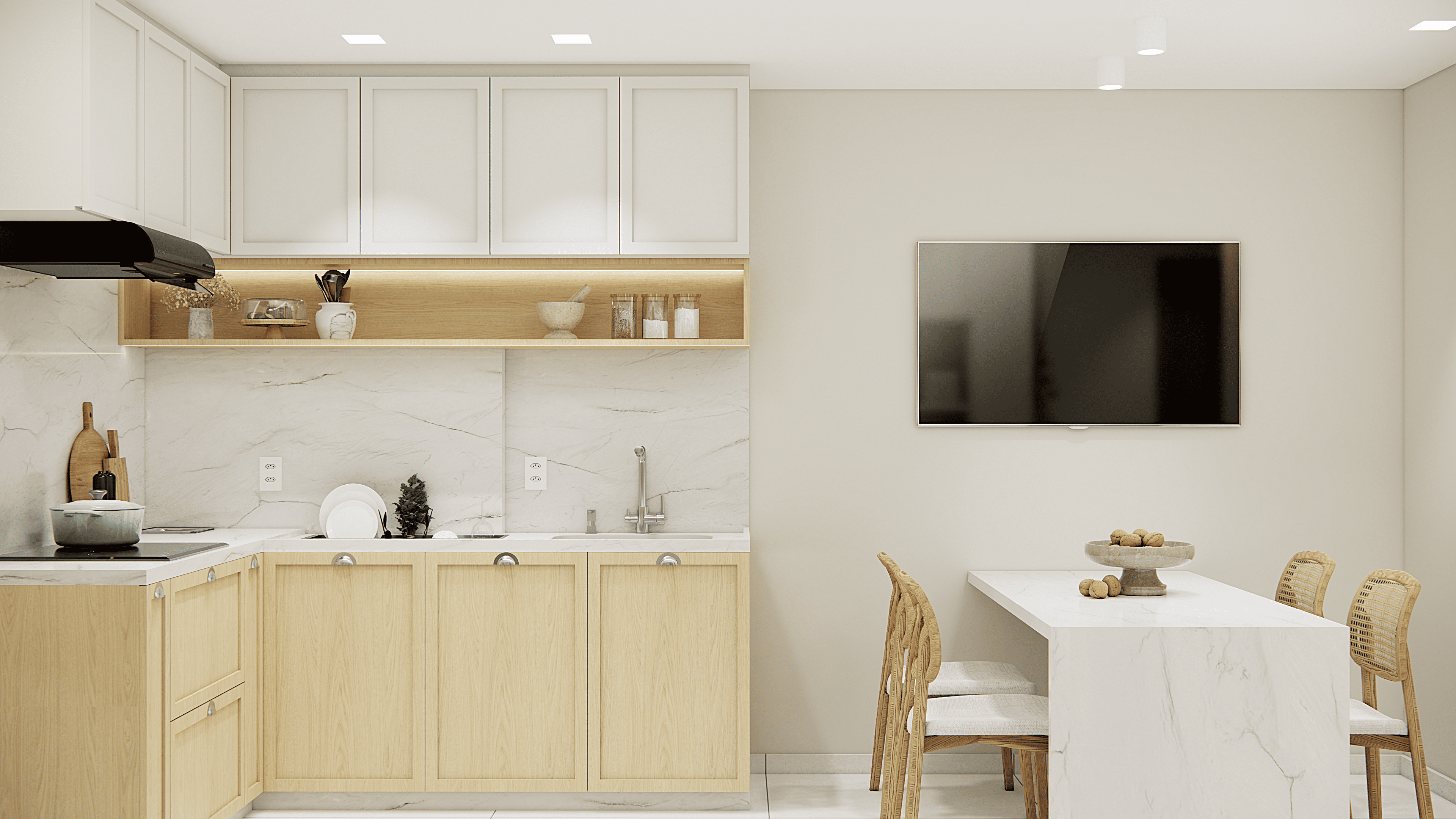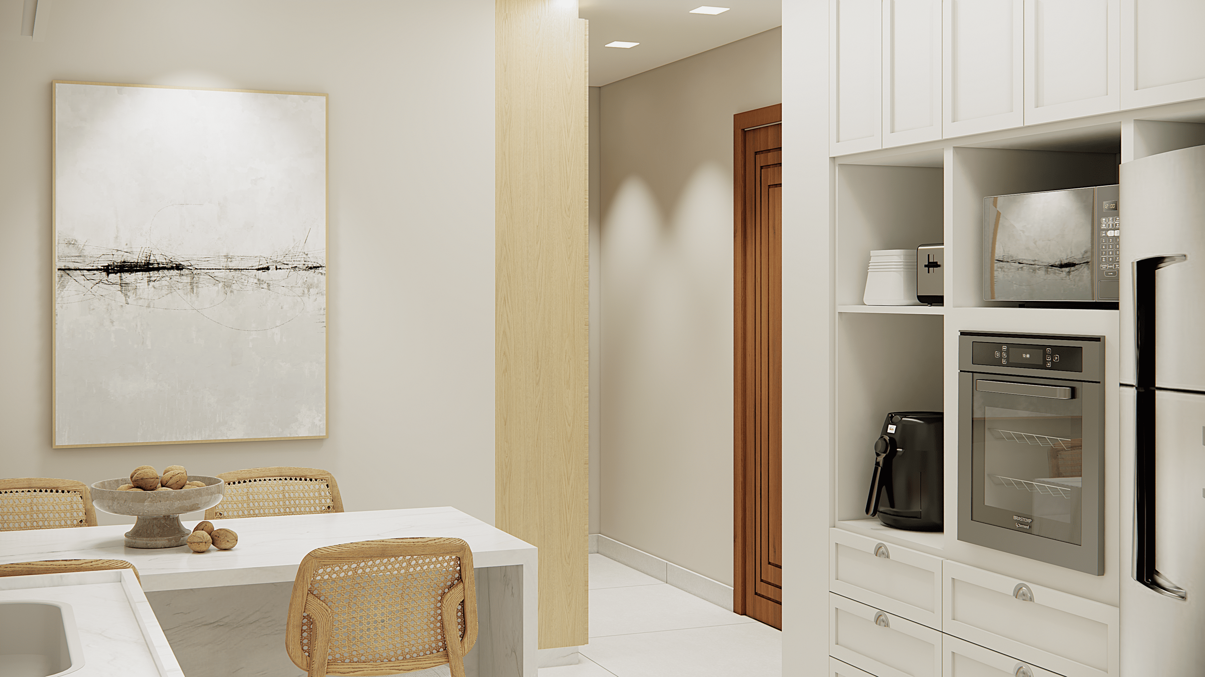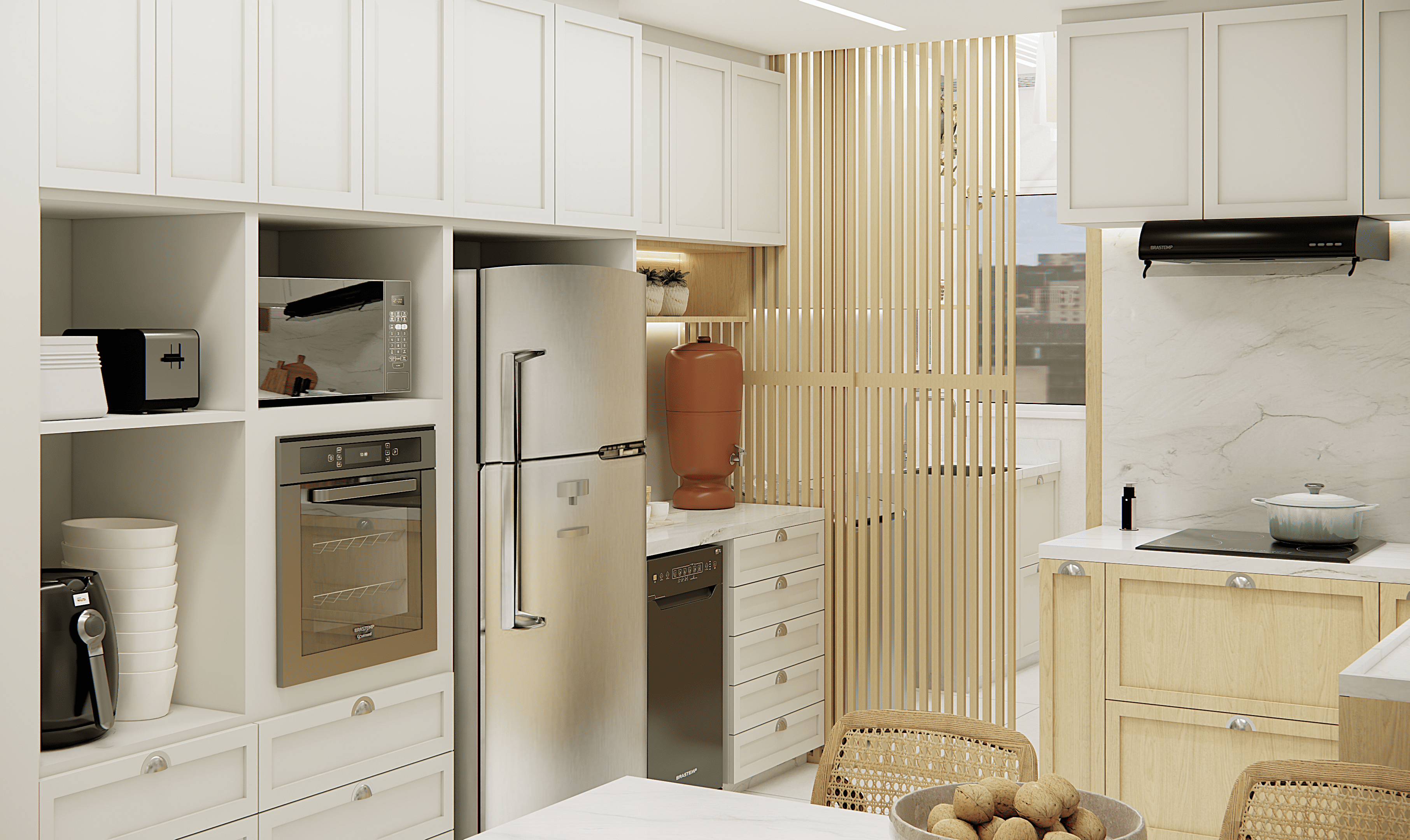 O ponto de partida deste projeto foi a escuta atenta às necessidades da cliente, que buscava transformar a cozinha em um espaço mais claro, funcional e agradável no dia a dia. Um dos principais incômodos era a falta de iluminação natural, já que a cozinha era isolada da área de serviço, de onde vinha a única entrada de luz do ambiente.